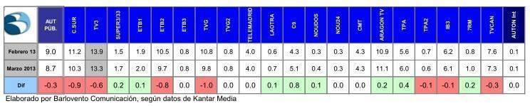 TPA alcanza el 6% en marzo, un punto menos que en 2012 TPA sube al 6% de share durante el mes de marzo. La cadena mejoró en 0,4 puntos el dato de febrero. En marzo de 2012 la autonómica conseguía un 7% de share, 1 punto más que en la actualidad.