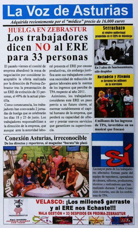 Asimismo, han repartido un número especial del periódico La Voz de Asturias, cabecera recientemente adquirida por Proíma-Zebrastur por 16.000 euros, dedicado monográficamente a repasar la situación de la empresa y su oposición al ERE de extinción de 33 personas.